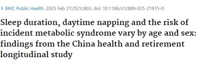 [2]Zhang, Bowen et al. “Sleep duration, daytime napping and the risk of incident metabolic syndrome vary by age and sex: findings from the China health and retirement longitudinal study.” BMC public health vol. 25,1 803. 27 Feb. 2025, doi:10.1186/s12889-025-21915-0